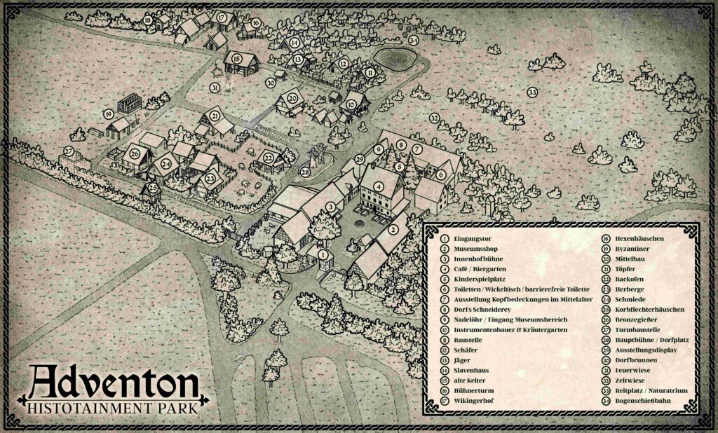 Familien-, Firmen-, Vereins- oder andere Gruppenausflüge in den Histotainment Park Adventon sind stets ein besonderes Erlebnis – aus verschiedenen Programmpunkten und Aktivitäten lassen sich individuelle Programme zusammenstellen, mit Musik, Tanz und Animation über Feuershows, Gaukelei oder Jonglage bis hin zu Bogenschießen, historischer Fechtschule, Kochen auf dem offenen Feuer oder eigener Mitarbeit auf einer historischen Baustelle.